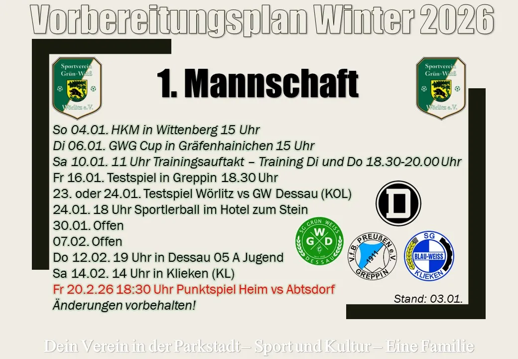 — 05.01.2026, Presse TeamUnsere Jungs belegten gestern bei der Hallenkreismeisterschaft den 8. Platz von 10. Sieger wurde völlig verdient der favorisierte Landesligist Fußballclub Grün-Weiß Piesteritz. Einen starken 2. Platz belegte SV ... [mehr]